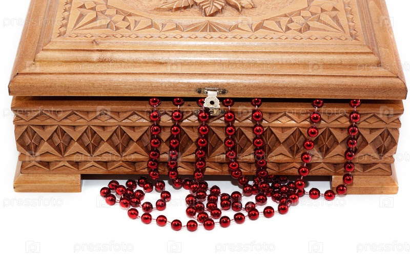 Деревянная шкатулка с бусинами на белом фоне