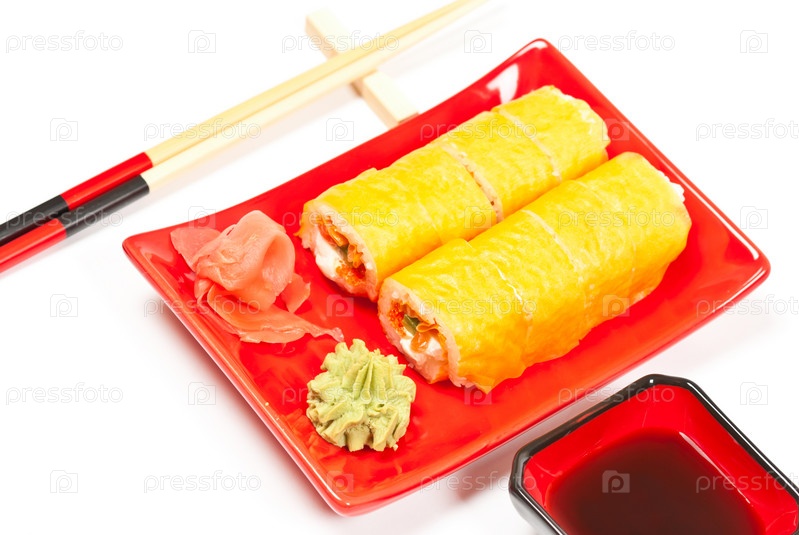 Суши на красной тарелке и палочки для еды
