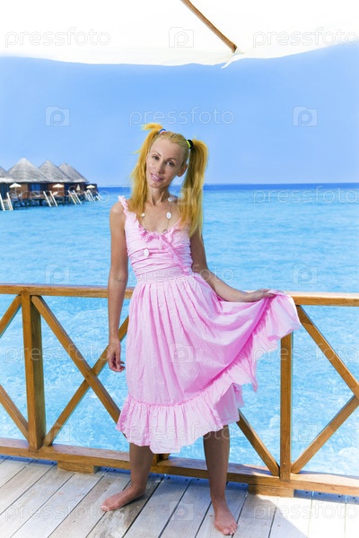 Женщина в розовом сарафане позирует на фоне океана, Мальдивские острова