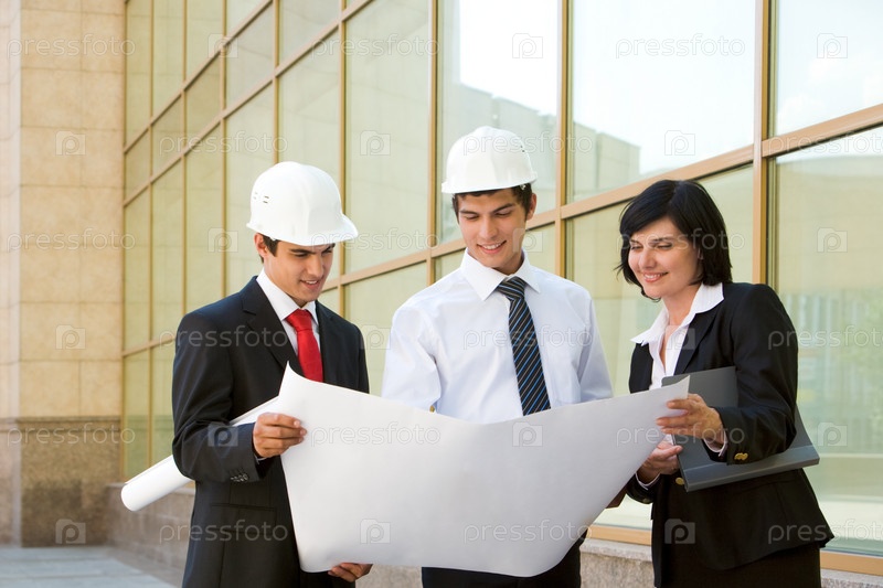 Изображение группы из трех рабочих, планирующих свою работу вместе