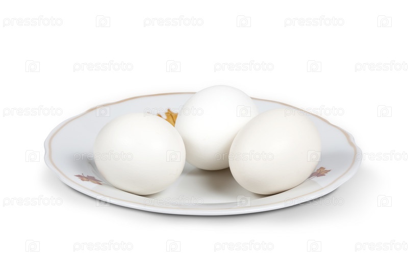 Три куриных яйца на тарелке на белом фоне