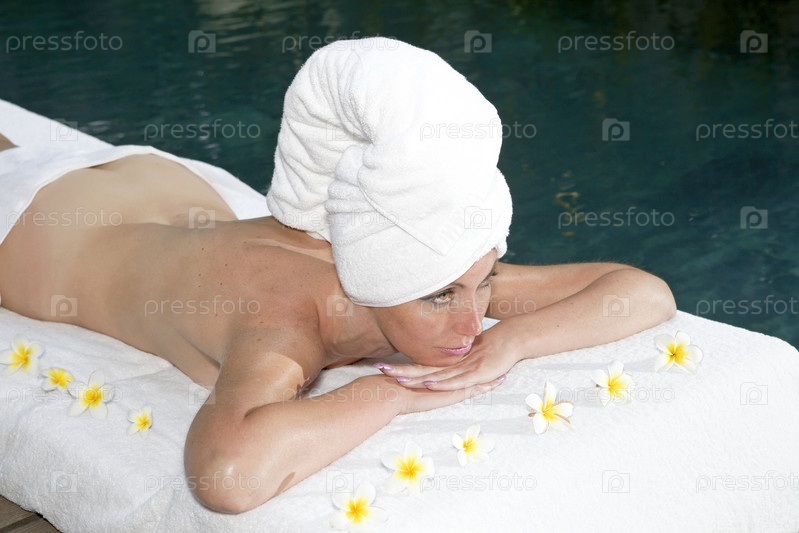 Молодая красивая женщина принимает спа-процедуры возле бассейна