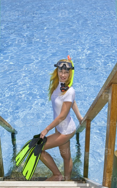 Молодая женщина стоит с оборудованием для подводного плавания на ступеньках лестницы к воде