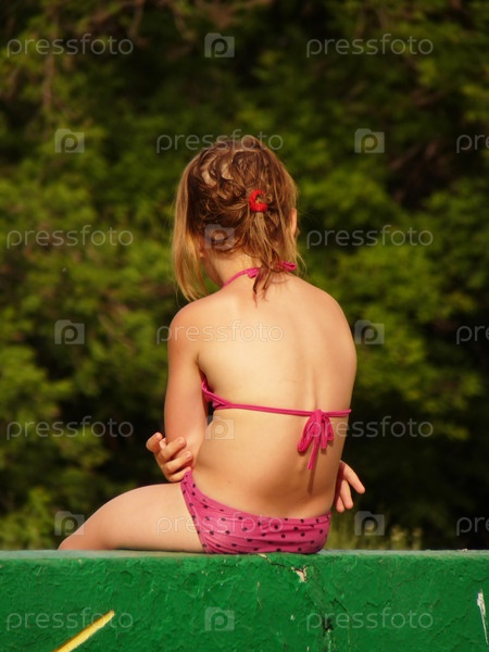 Маленькая девочка в купальнике сидит спиной к камере