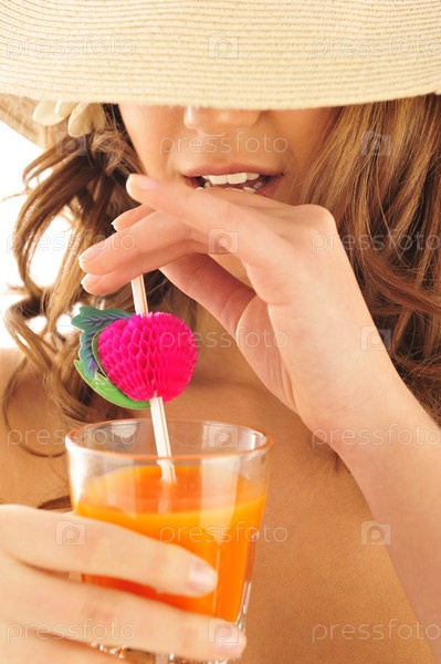 Девушка в шляпе пьет сок