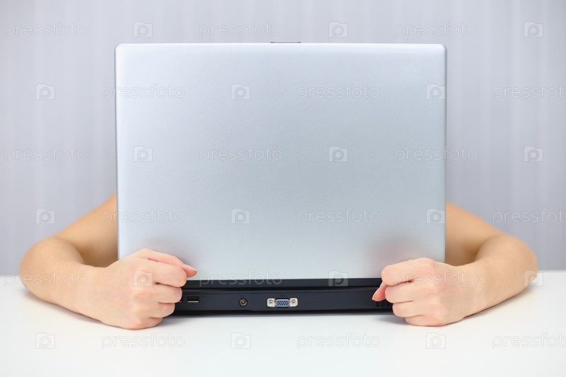 Девушка спряталась за ноутбуком