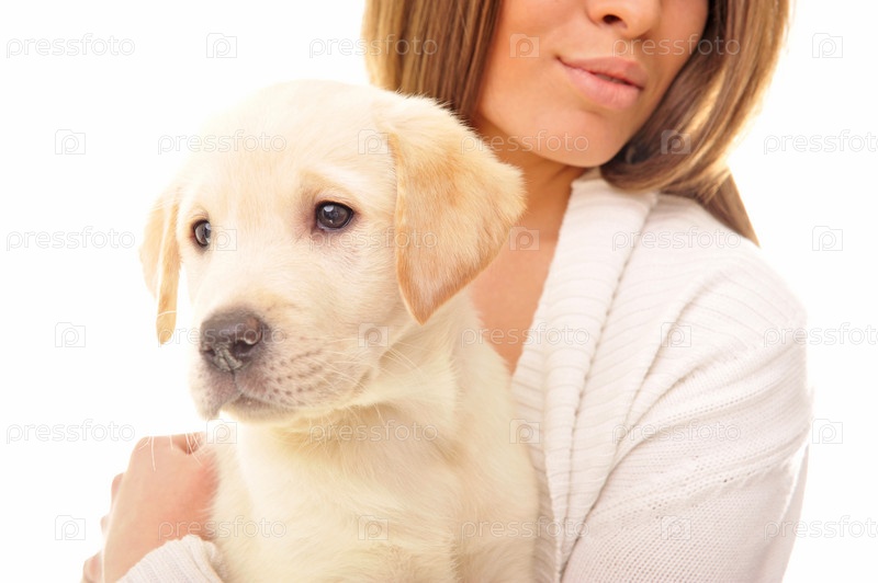 Девушка с щенком на белом фоне