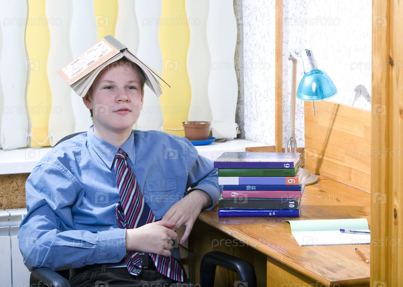 Ученик с книгой на голове делает домашнее задание
