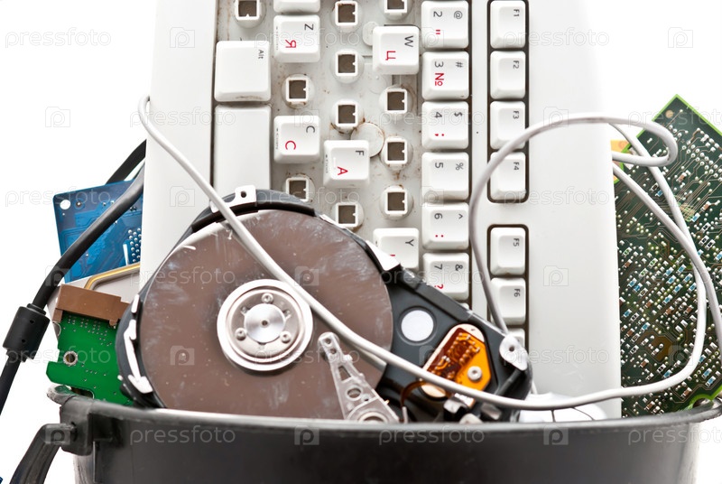 Комплектующие для компьютера в мусорном ведре, крупный план