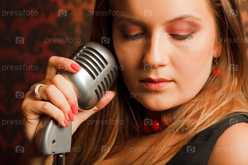 Элегантная блондинка с закрытыми глазами с ретро-микрофоном в руках