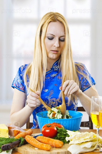 Молодая женщина готовит салат на современной кухне