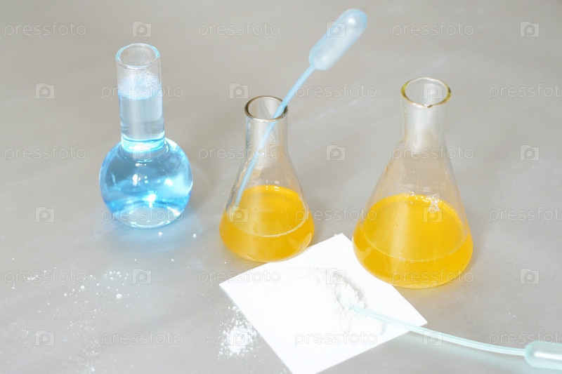 Стеклянные колбы с жидкостями и белый порошок