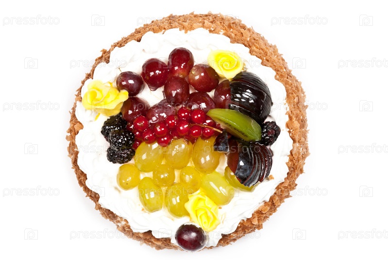 Торт с фруктами и взбитыми сливками на белом фоне