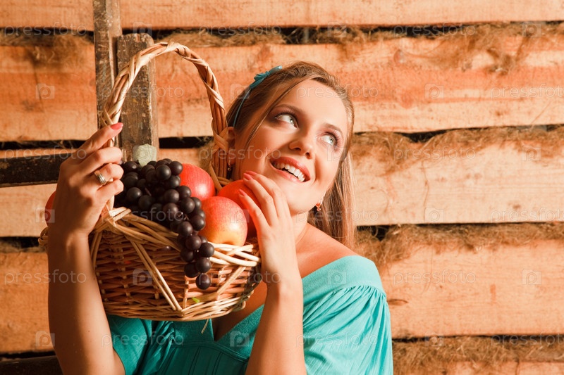 Женщина с корзиной фруктов на фоне деревянной стены