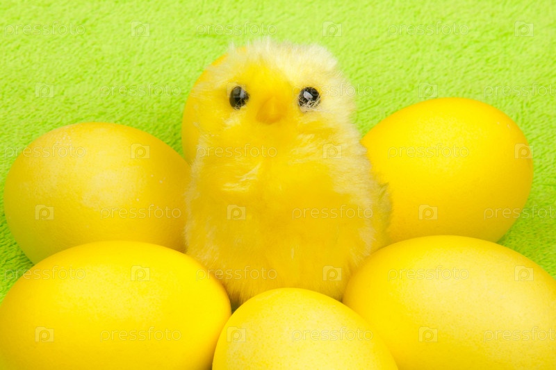 Желтые яйца и цыпленок в центре на зеленом фоне