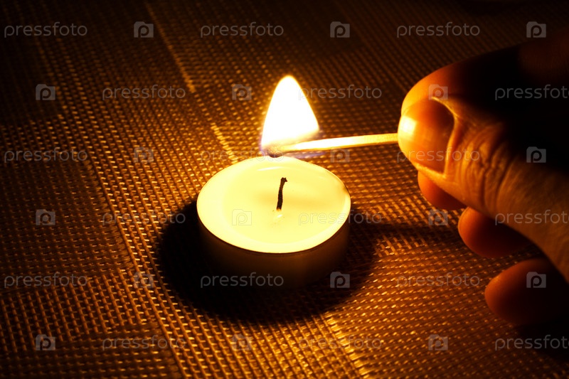 Рука со спичкой зажигает свечу в темноте