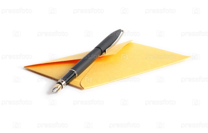 Желтый конверт и ручка на белом фоне