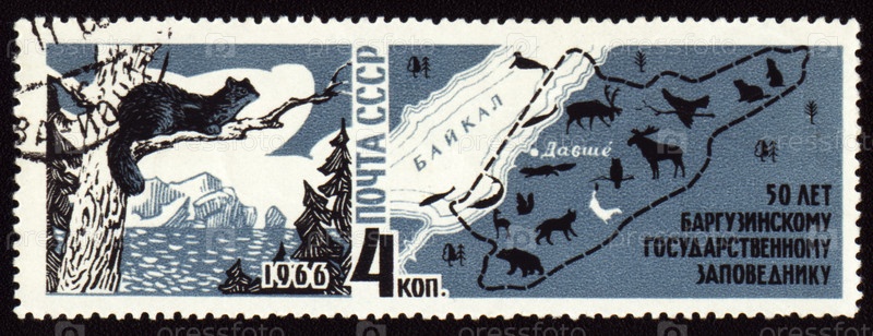 Почтовая марка СССР 1966 года к 50-летию заповедника Баргузинский, карта Байкальского региона и соболь на ветке дерева