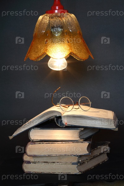 Стопка книг и очки под горящей лампой на темном фоне