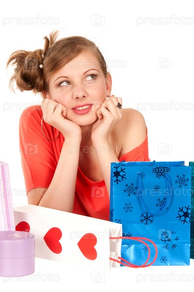 Мечтающая молодая женщина с пакетами для покупок