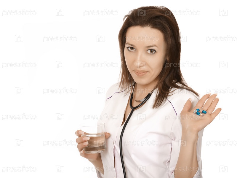 Врач держит в руке таблетки и стакан воды