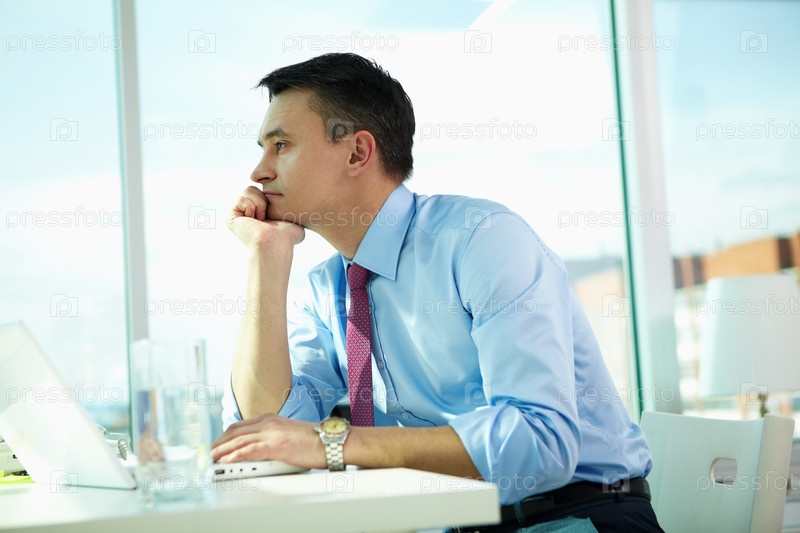 Бизнесмен сидит в офисе за рабочим столом и думает