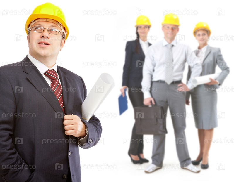 Четыре специалиста в желтых строительных касках стоят на белом фоне