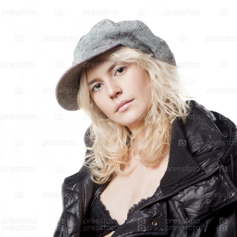 Портрет красивой девушки в фуражке на белом фоне