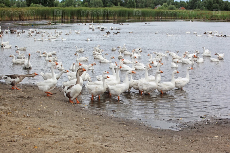 Стая гусей на водоеме