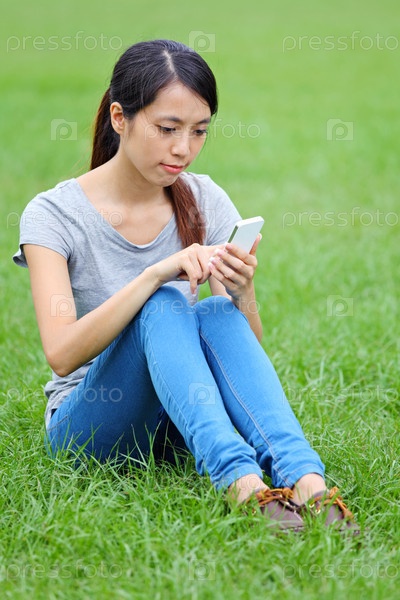 Азиатская женщина со смартфоном на траве