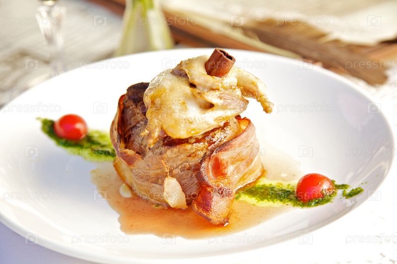 Печеная говядина, обернутая в бекон с корицей и перепелкой