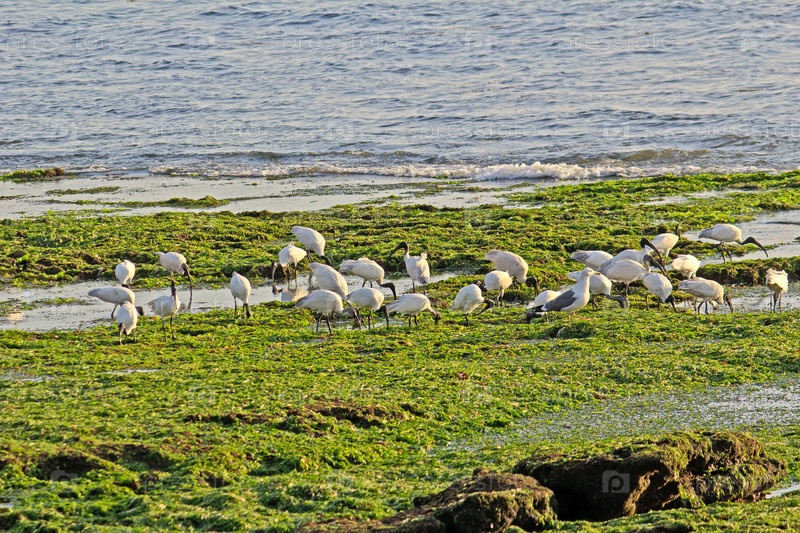 Ибисы и чайки ищут добычу среди водорослей во время отлива