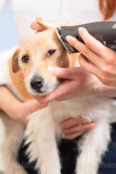 Парикмахер стрижет собаку породы Джек-Рассел терьер