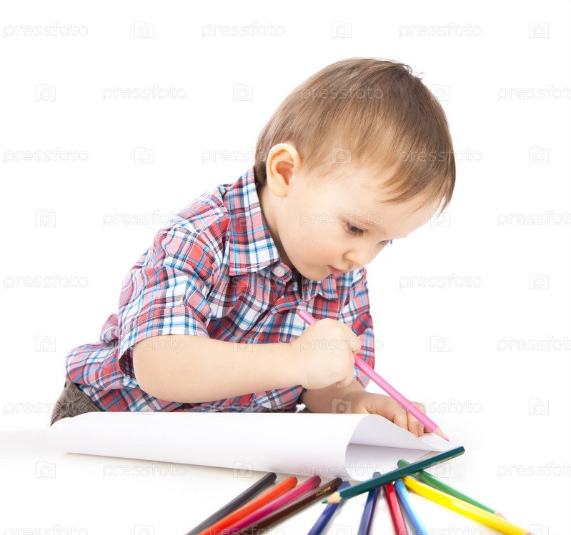 Маленький мальчик в рубашке рисует на белом фоне
