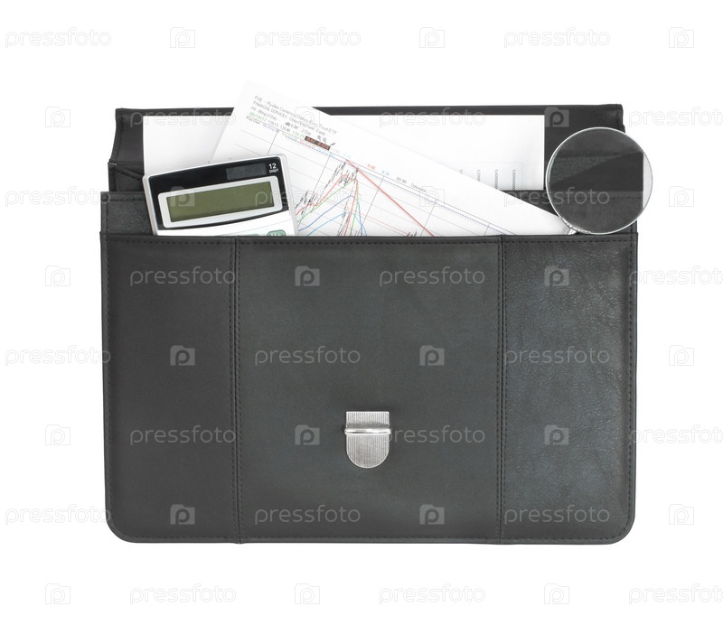 Открытый черный портфель с документами и калькулятором