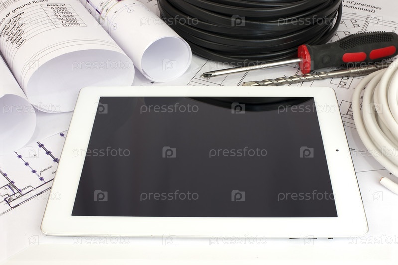 Электрический кабель и планшет на чертежах