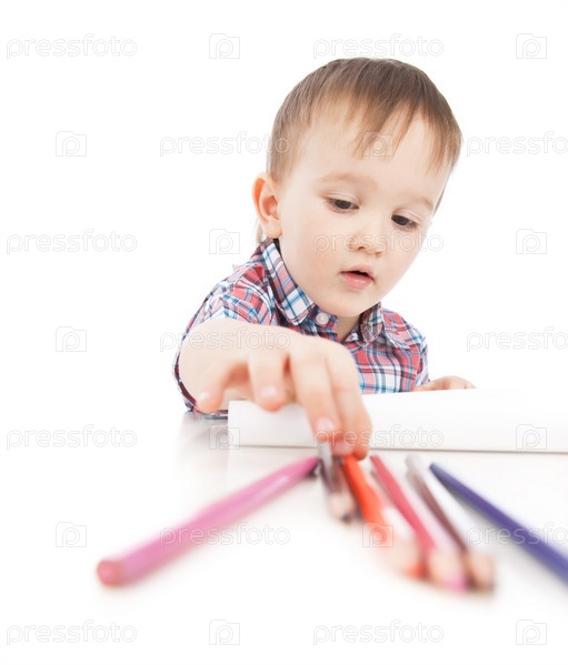 Маленький мальчик в рубашке с цветными карандашами на белом фоне