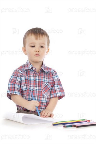 Маленький мальчик в рубашке с цветными карандашами на белом фоне