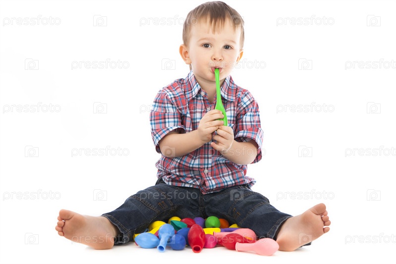 Маленький мальчик в рубашке с цветными шариками на белом фоне