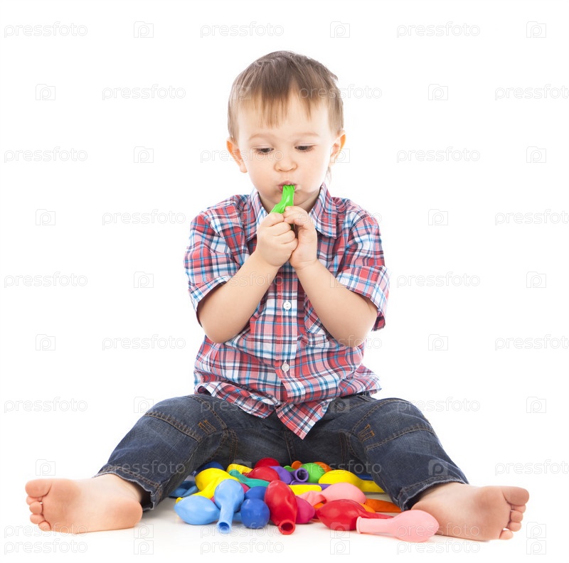 Маленький мальчик в рубашке с цветными шариками на белом фоне