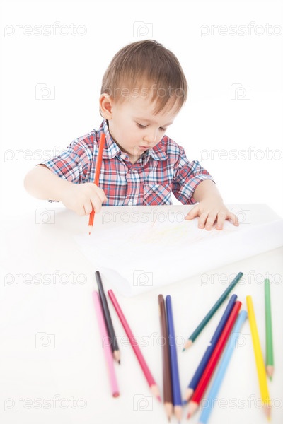 Маленький мальчик рисует карандашами