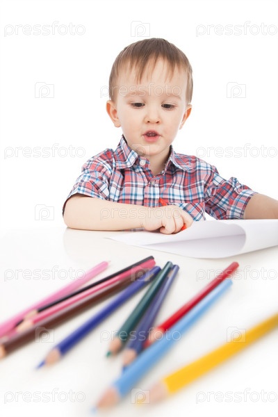 Маленький мальчик рисует карандашами