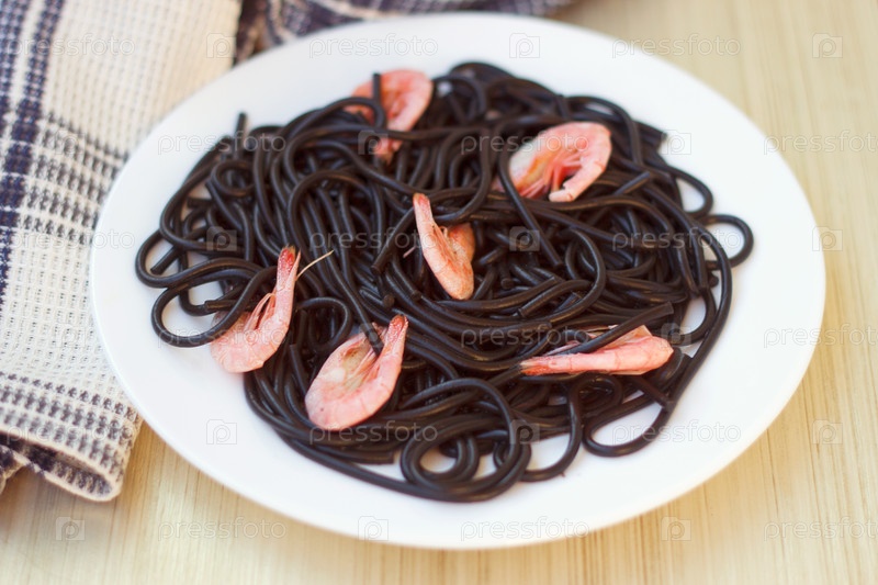 Черные макароны тальятелли с креветками