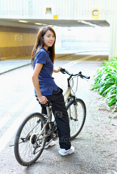 Молодая женщина с велосипедом в городе