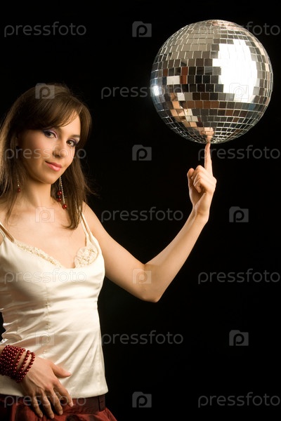 Девушка с диско-шаром на черном фоне