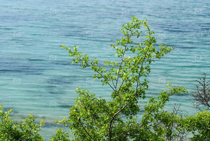 Зацветающая ветка боярышника на фоне моря
