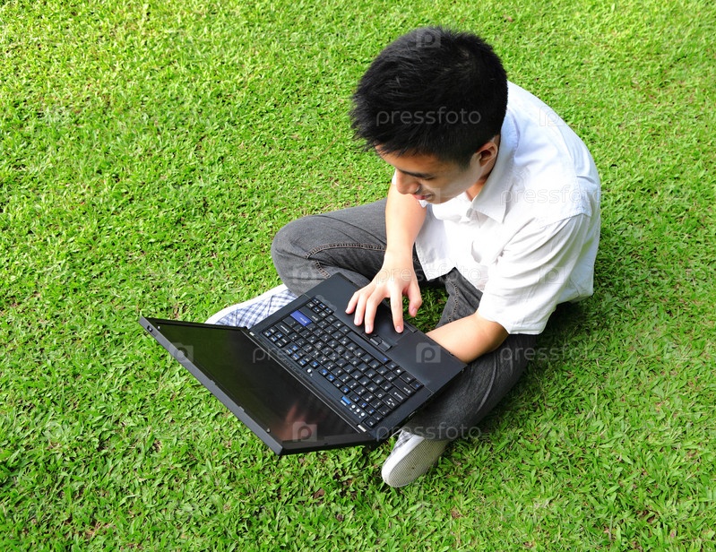 Азиатский мужчина с ноутбуком в парке