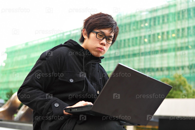 Юноша с ноутбуком на улице