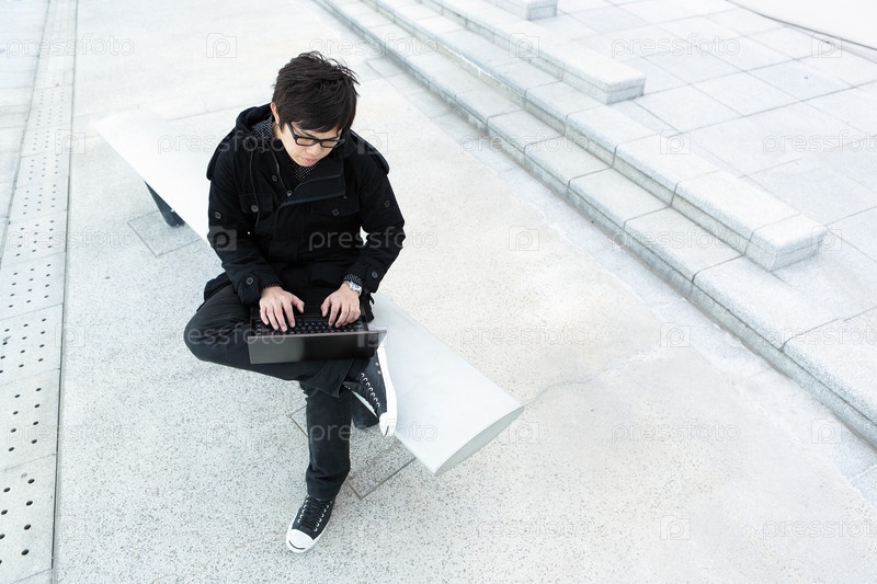 Юноша с ноутбуком на улице