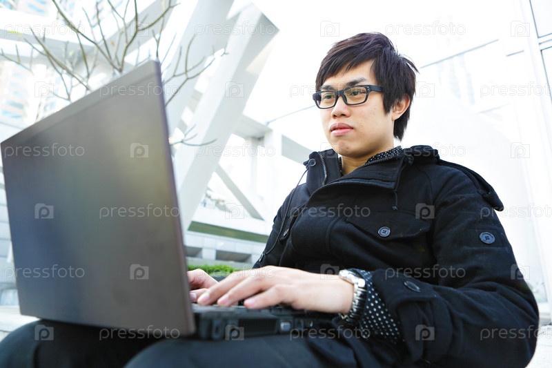 Юноша с ноутбуком на улице